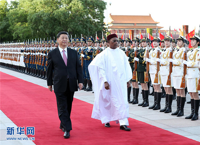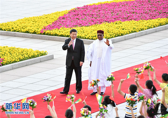 5月28日,國家主席習近平在北京人民大會堂同尼日爾總統(tǒng)伊素福舉行會談。這是會談前,習近平在人民大會堂東門外廣場為伊素福舉行歡迎儀式。 新華社記者 殷博古 攝
