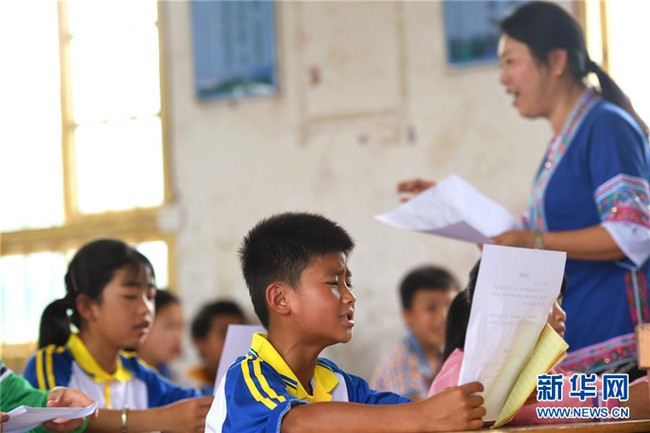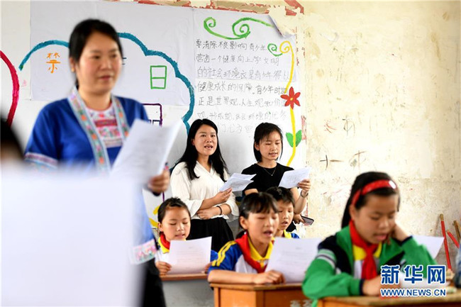 5月27日,在廣西柳州市三江侗族自治縣良口鄉(xiāng)燕茶村燕子小學(xué),吳純娟在教五年級(jí)的學(xué)生唱侗族大歌。