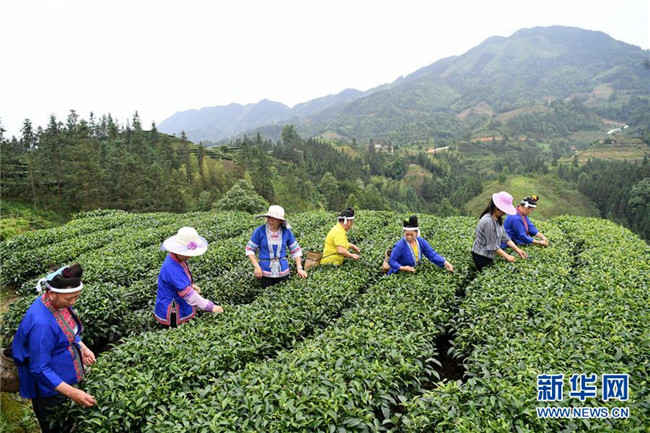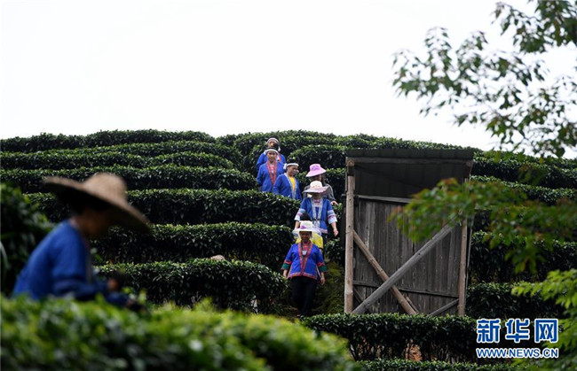 5月28日,在廣西柳州市三江侗族自治縣良口鄉(xiāng)燕茶村,吳純娟(左三)到茶園里了解村民茶葉種植情況。