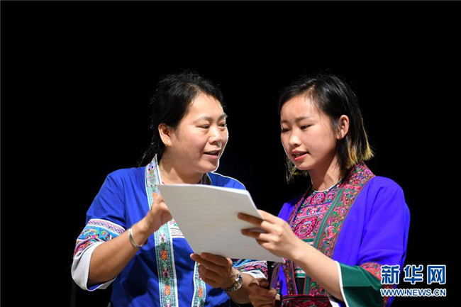 5月27日晚,在廣西柳州市三江侗族自治縣良口鄉(xiāng)燕茶村戲臺(tái)前,吳純娟(左)對(duì)楊雪連進(jìn)行發(fā)音指導(dǎo)。