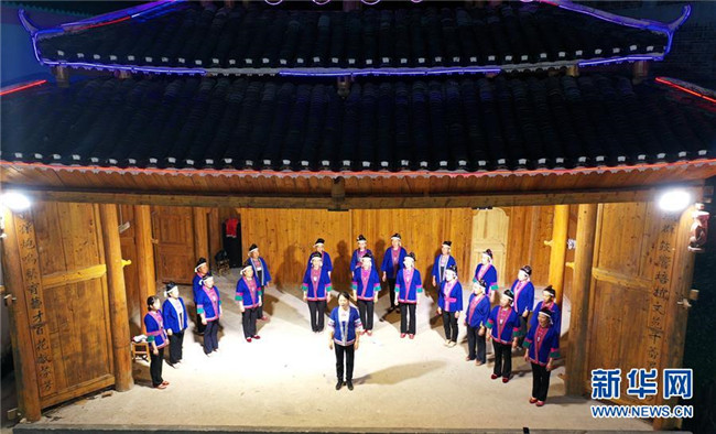 5月27日晚,在廣西柳州市三江侗族自治縣良口鄉(xiāng)燕茶村,吳純娟(前排中)與村民在戲臺(tái)上排練侗族大歌(無(wú)人機(jī)拍攝)。