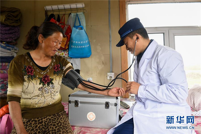 奇乾中隊隊醫(yī)為營地附近僅有的幾戶村民測量血壓(5月19日攝)。新華社記者 劉磊 攝