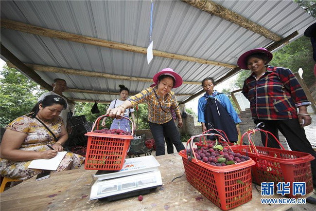 6月15日,在丹寨縣揚(yáng)武鎮(zhèn)老冬村楊梅種植園,果農(nóng)在給采摘好的楊梅稱重。新華社發(fā)(黃曉海 攝)