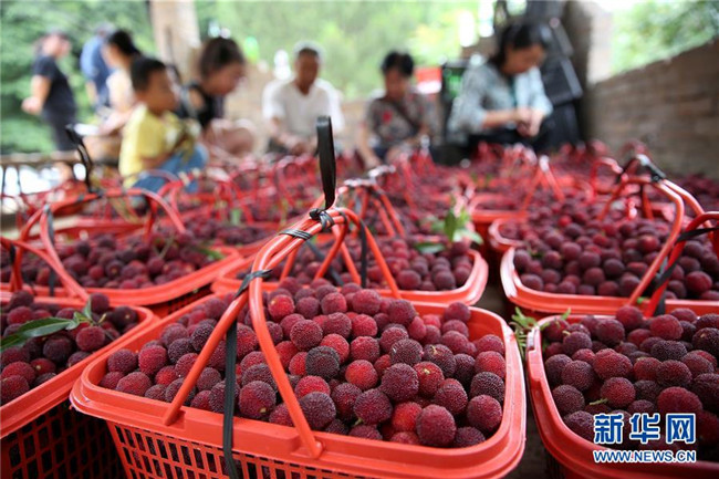 6月15日,在丹寨縣揚(yáng)武鎮(zhèn)老冬村楊梅種植園,果農(nóng)在轉(zhuǎn)運(yùn)采摘的楊梅。新華社發(fā)(黃曉海 攝)