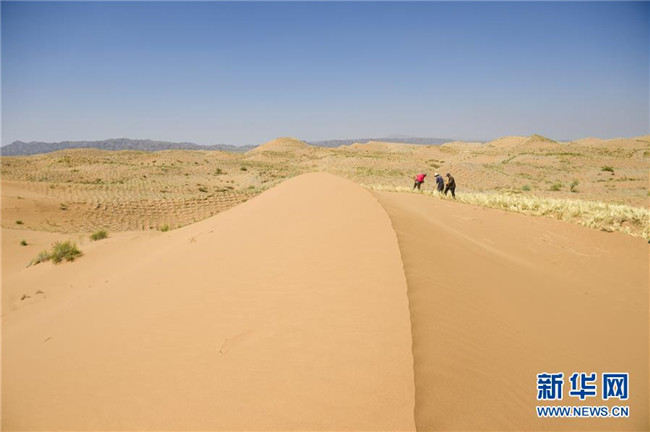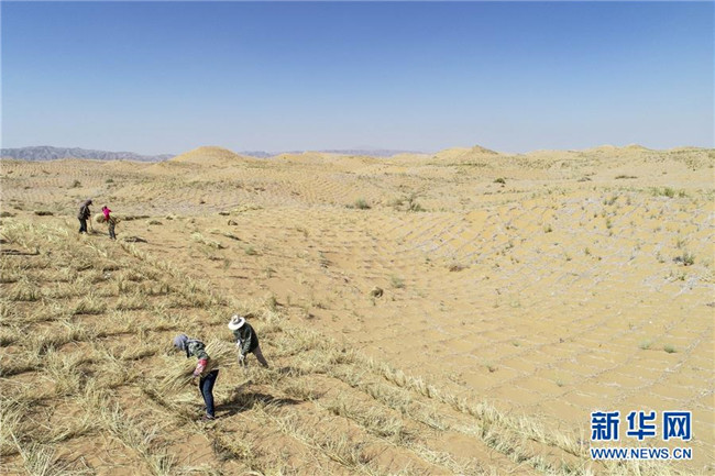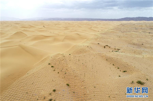 寧夏中衛(wèi)市位于騰格里沙漠南緣,在長期抵抗沙漠化侵襲的實踐和探索中,一套“先固后治,固阻結合”的防沙治沙新模式在這里應用。人們利用草方格固沙,在扎好的草方格中播撒草種,形成植物沙障。據了解,截至2018年底中衛(wèi)市已完成沙區(qū)治理147萬畝。新華社記者馮開華攝
