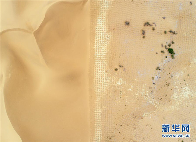 寧夏中衛(wèi)市長流水沙區(qū),一邊是沙漠,另一邊是用草方格治理后已生長出植被的區(qū)域(6月12日無人機拍攝)。新華社記者馮開華攝