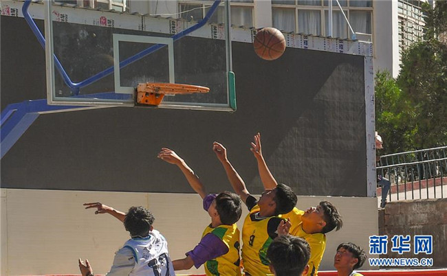 鹽井中學(xué)的學(xué)生們在體育課上打籃球(6月6日攝)。年輕的藏族女教師坐在鋼琴前,手指靈動地彈奏樂曲,兩名學(xué)生拉起弦子伴奏,三十多名學(xué)生站成四排,齊聲合唱。學(xué)校籃球場上數(shù)名身材高大的學(xué)生,正在體育老師的組織下進行激烈的分組對抗,不一會兒,學(xué)生們個個汗流浹背。綜合樓三樓的化學(xué)實驗室內(nèi),身穿白色大褂的學(xué)生,分成若干小組,正在做簡單的化學(xué)實驗。這一幕幕,同時出現(xiàn)在西藏昌都市芒康縣鹽井中學(xué)。新華社記者晉美多吉攝