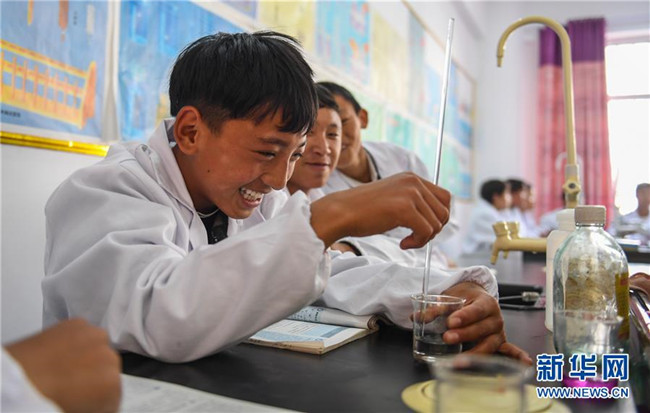 鹽井中學(xué)的學(xué)生們在上化學(xué)課(6月6日攝)。年輕的藏族女教師坐在鋼琴前,手指靈動地彈奏樂曲,兩名學(xué)生拉起弦子伴奏,三十多名學(xué)生站成四排,齊聲合唱。學(xué)校籃球場上數(shù)名身材高大的學(xué)生,正在體育老師的組織下進行激烈的分組對抗,不一會兒,學(xué)生們個個汗流浹背。綜合樓三樓的化學(xué)實驗室內(nèi),身穿白色大褂的學(xué)生,分成若干小組,正在做簡單的化學(xué)實驗。這一幕幕,同時出現(xiàn)在西藏昌都市芒康縣鹽井中學(xué)。新華社記者晉美多吉攝