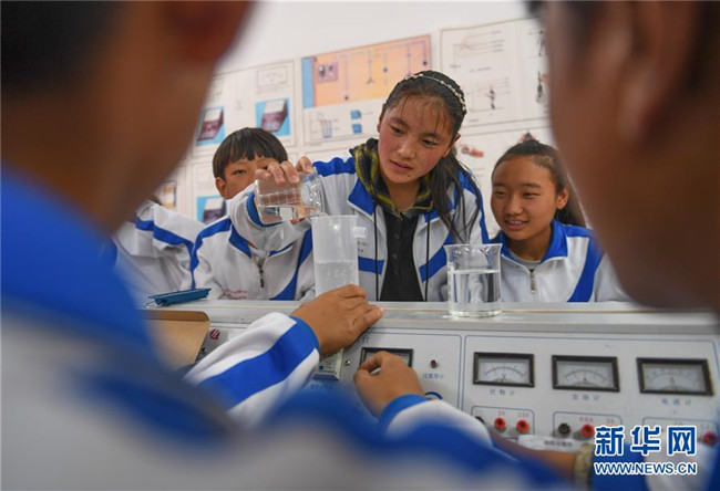 鹽井中學(xué)的學(xué)生們在上物理課(6月6日攝)。年輕的藏族女教師坐在鋼琴前,手指靈動地彈奏樂曲,兩名學(xué)生拉起弦子伴奏,三十多名學(xué)生站成四排,齊聲合唱。學(xué)?;@球場上數(shù)名身材高大的學(xué)生,正在體育老師的組織下進行激烈的分組對抗,不一會兒,學(xué)生們個個汗流浹背。綜合樓三樓的化學(xué)實驗室內(nèi),身穿白色大褂的學(xué)生,分成若干小組,正在做簡單的化學(xué)實驗。這一幕幕,同時出現(xiàn)在西藏昌都市芒康縣鹽井中學(xué)。新華社記者晉美多吉攝