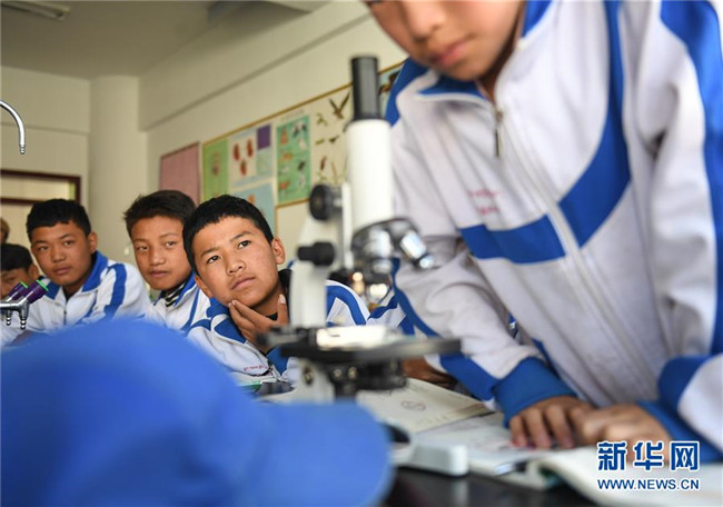 鹽井中學(xué)的學(xué)生們在上生物課(6月6日攝)。年輕的藏族女教師坐在鋼琴前,手指靈動地彈奏樂曲,兩名學(xué)生拉起弦子伴奏,三十多名學(xué)生站成四排,齊聲合唱。學(xué)校籃球場上數(shù)名身材高大的學(xué)生,正在體育老師的組織下進行激烈的分組對抗,不一會兒,學(xué)生們個個汗流浹背。綜合樓三樓的化學(xué)實驗室內(nèi),身穿白色大褂的學(xué)生,分成若干小組,正在做簡單的化學(xué)實驗。這一幕幕,同時出現(xiàn)在西藏昌都市芒康縣鹽井中學(xué)。新華社記者晉美多吉攝