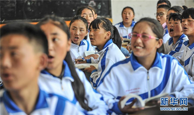 鹽井中學(xué)的學(xué)生們在上英語課(6月6日攝)。年輕的藏族女教師坐在鋼琴前,手指靈動地彈奏樂曲,兩名學(xué)生拉起弦子伴奏,三十多名學(xué)生站成四排,齊聲合唱。學(xué)校籃球場上數(shù)名身材高大的學(xué)生,正在體育老師的組織下進行激烈的分組對抗,不一會兒,學(xué)生們個個汗流浹背。綜合樓三樓的化學(xué)實驗室內(nèi),身穿白色大褂的學(xué)生,分成若干小組,正在做簡單的化學(xué)實驗。這一幕幕,同時出現(xiàn)在西藏昌都市芒康縣鹽井中學(xué)。新華社記者晉美多吉攝