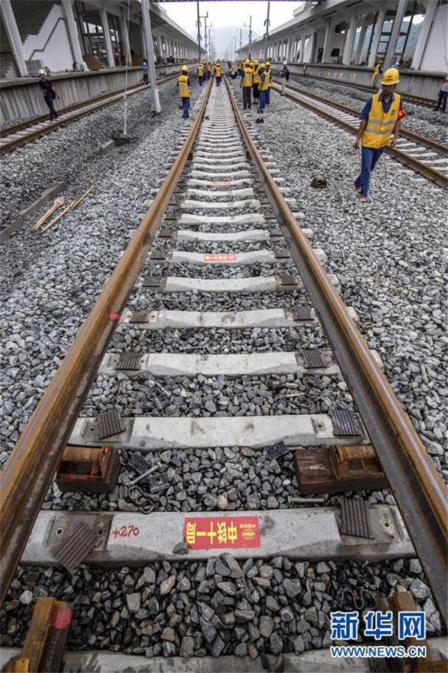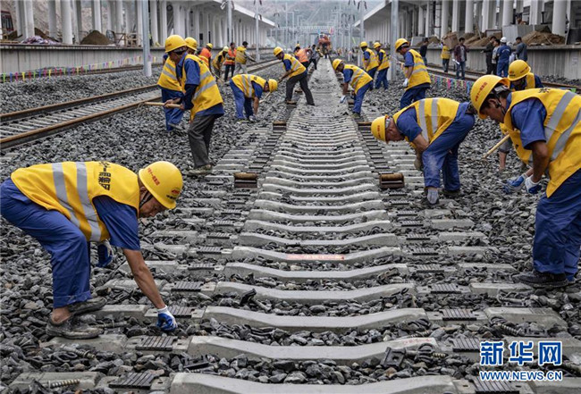 6月22日,中鐵十一局三公司職工在湖北省十堰市十堰北站為漢十高鐵最后一組500米長(zhǎng)軌鋪設(shè)做準(zhǔn)備。新華社記者 杜華舉 攝