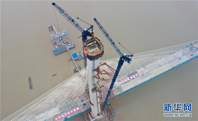 當日,滬通長江大橋南主塔順利封頂。至此,該橋兩座高達330米的主塔全部建成,標志著世界最大跨度公鐵兩用斜拉橋建設取得了關鍵性進展。滬通長江大橋全長11072米,主橋長2296米,主跨1092米,是滬通鐵路全線的控制性工程,設計為上層6車道高速公路,下層4線鐵路。新華社發(fā)(許叢軍攝)