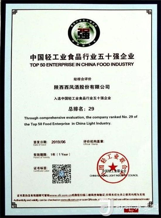 “中國輕工業(yè)食品行業(yè)五十強(qiáng)企業(yè)”榜單是評價(jià)輕工業(yè)食品企業(yè)競爭力的權(quán)威榜單,也是衡量中國輕工業(yè)食品企業(yè)發(fā)展活力的重要標(biāo)準(zhǔn)。此次榜單在評選標(biāo)準(zhǔn)上重點(diǎn)考量了2018年度參評企業(yè)的營業(yè)收入、利潤總額、營業(yè)收入利潤率、稅收占利稅比重、研發(fā)投入及營業(yè)收入增速六項(xiàng)指標(biāo)綜合評分,力求結(jié)合互聯(lián)網(wǎng)時(shí)代特征對企業(yè)進(jìn)行充分全面的評估,要求企業(yè)不僅能夠?qū)崿F(xiàn)均衡發(fā)展,還要具備較強(qiáng)的市場活力。西鳳股份公司憑借出色的經(jīng)營業(yè)績和綜合表現(xiàn),獲得了大會的一致認(rèn)可。