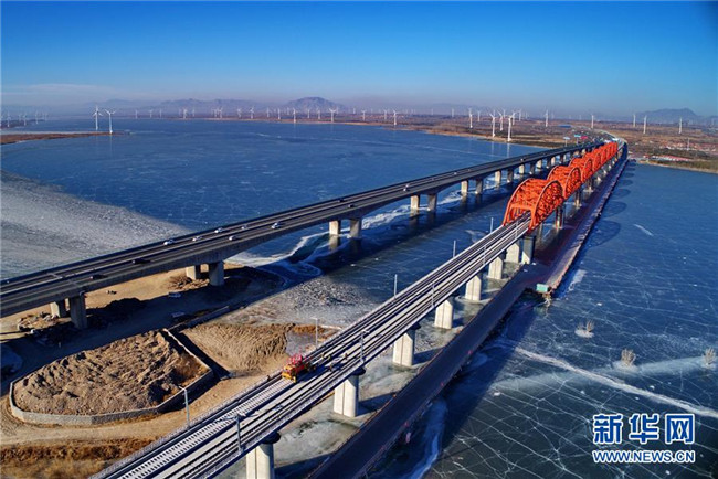 中鐵三局工人在河北張家口京張高鐵官?gòu)d水庫(kù)特大橋進(jìn)行鋪軌作業(yè)(1月13日無人機(jī)拍攝)。新華社記者 楊世堯 攝