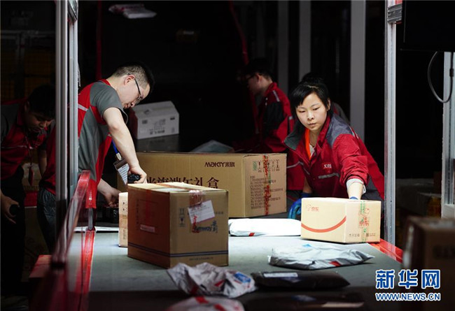 工人在位于西安的京東智能物流中心細(xì)分區(qū)龍門架下整理包裹(6月3日攝)。龍門架掃描后,包裹的出庫(kù)物流信息將自動(dòng)更新。新華社記者 邵瑞 攝