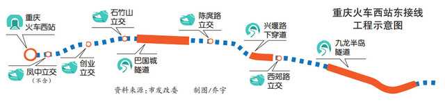 據(jù)介紹,重慶火車西站東接線工程位于九龍坡區(qū),西起內(nèi)環(huán)鳳中立交(不含),連接重慶西站,東接規(guī)劃黃桷坪長江大橋(不含)。主要工程包括長隧道2座(九龍半島隧道、巴國城隧道),中隧道1座(興堰路下穿道),互通立交2座(石竹山立交、陳庹路立交)、簡易立交2座(創(chuàng)業(yè)立交、西郊路立交)。