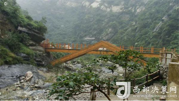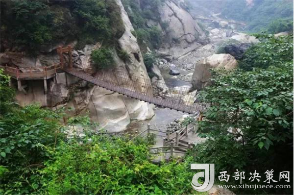踏進峪口,頭頂是遮天蔽日的綠色,四周水聲潺潺,鳥鳴悅耳,空谷幽靈,沉靜自然,涼爽的山風夾雜著花草的芳香,瞬間就滋潤了燥熱的心情。迎著溪谷逆水而上,山的奇特與水的靈秀交織在一起,伴著水聲,綿延著向更遠處伸展。若有情致,卷起褲腿,或穿上沙灘鞋,或赤足,踏著被溪水長久沖刷平整光滑的大石頭,任由清涼通透的溪水撫摸雙足,沁心入骨,仿佛拾回了童年的歡樂,煩擾憂愁全無蹤影。臨水而筑的棧道,全程依水而行,曲徑通幽,每轉(zhuǎn)一道彎,都是一幅新景。