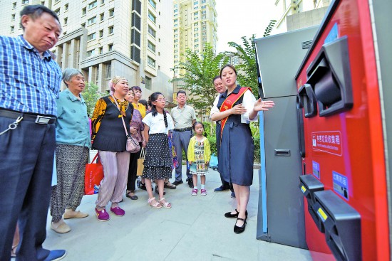 圖③:7月7日,社區(qū)垃圾分類(lèi)志愿者向居民介紹智能垃圾分類(lèi)回收設(shè)備。