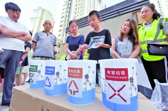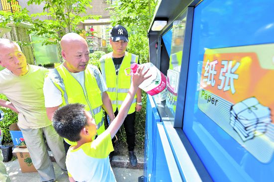 圖①:7月7日,社區(qū)垃圾分類(lèi)志愿者協(xié)助小朋友進(jìn)行垃圾分類(lèi)投放。