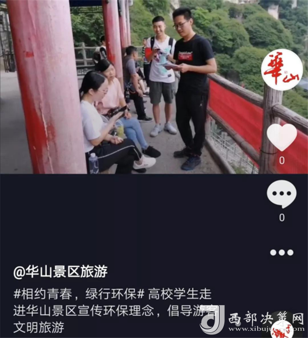活動(dòng)還通過(guò)高校網(wǎng)絡(luò)紅人拍攝抖音“青春最美,華山見(jiàn)證”主題短視頻等傳播方式,在網(wǎng)絡(luò)線上形成熱度,為華山綠色環(huán)保游提供了新方式。