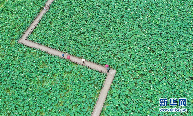 在江西省南昌市新建區(qū)聯(lián)圩鎮(zhèn),游客在當(dāng)?shù)氐那М€荷花園觀賞游玩(7月20日無人機拍攝)。新華社記者 彭昭之 攝