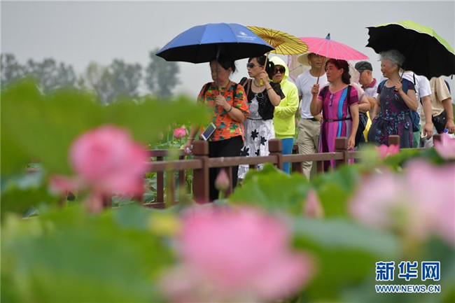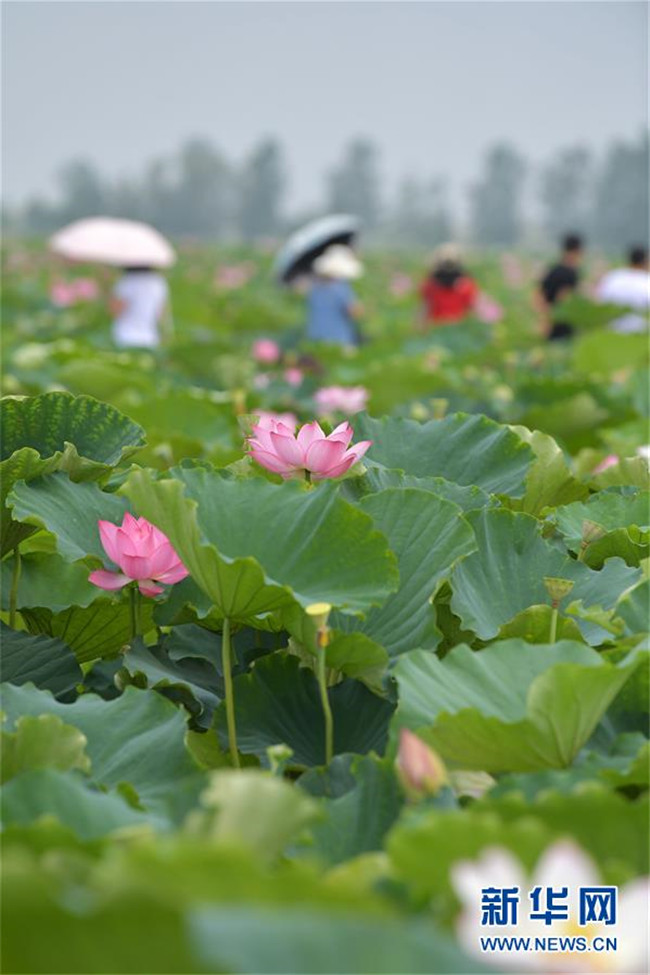 在江西省南昌市新建區(qū)聯(lián)圩鎮(zhèn),游客在當(dāng)?shù)氐那М€荷花園觀賞游玩(7月20日攝)。新華社記者 彭昭之 攝