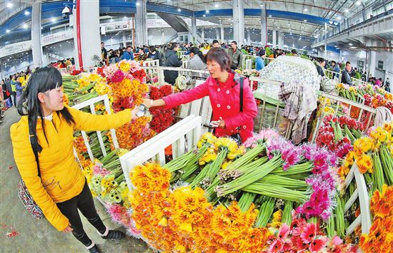 云花是云南省一張亮麗的名片。2018年,云花總產(chǎn)值達到525.9億元,40多萬從業(yè)者參與到這份美好的事業(yè)中,成為脫貧致富和全面建成小康社會的重要產(chǎn)業(yè)力量。圖為斗南花市上忙碌的賣花人。(記者黃喆春攝)