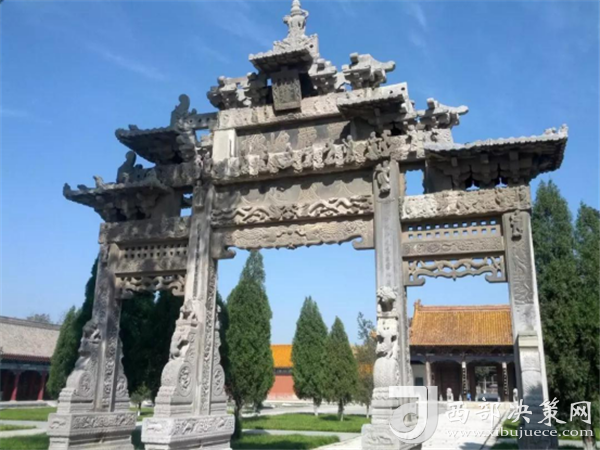 “天威咫尺”石牌樓明萬歷年所建,結(jié)構(gòu)為四柱三開間五樓式金青石牌樓。結(jié)構(gòu)精巧,內(nèi)容豐富,雕刻手法細致、全面。運用圓雕、浮雕、線雕、透雕等各種雕刻手法。