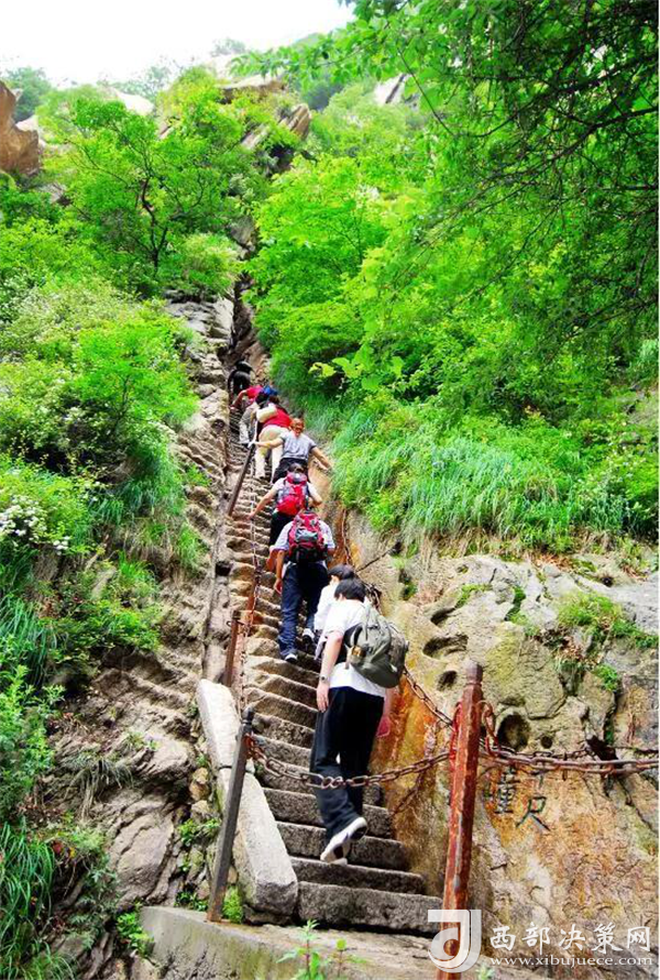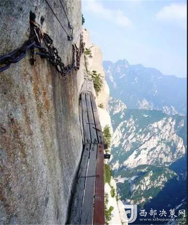 長空棧道位于華山南峰東側(cè)山腰,在約2160米垂直的崖壁上鑿洞、插楔、鋪板搭制而成的“長空棧道”,腳下便是萬丈深淵,勇敢的人如履平地,稍畏懼者便是膽戰(zhàn)心驚,屏氣挪步。