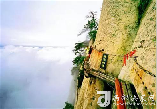 在萬仞絕壁上鑲嵌石釘搭木椽而筑,棧道上下皆是懸崖絕壁,鐵索橫懸,游人至此,面壁貼腹,屏氣挪步,被譽為“華山第一天險”。