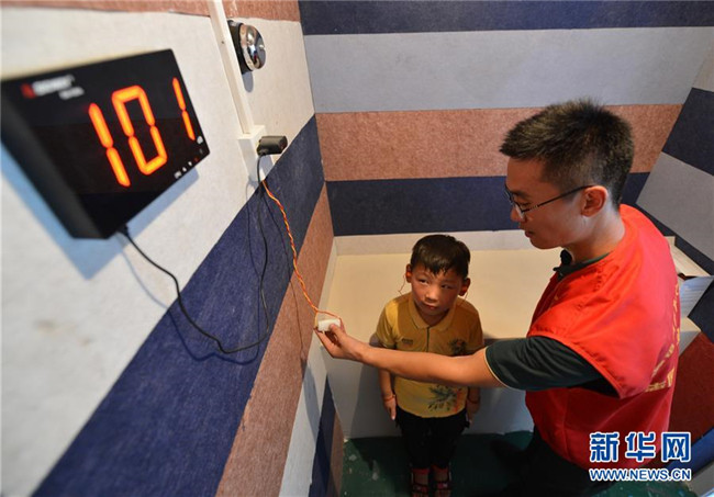 8月8日,在汶上縣劉樓鎮(zhèn)安全教育體驗(yàn)基地,小朋友在工作人員幫助下體驗(yàn)噪聲污染。