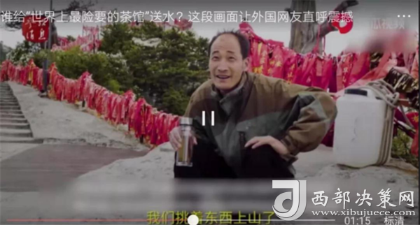 視頻介紹,煮茶所需的水都是挑山工肩挑背扛運上來的。
