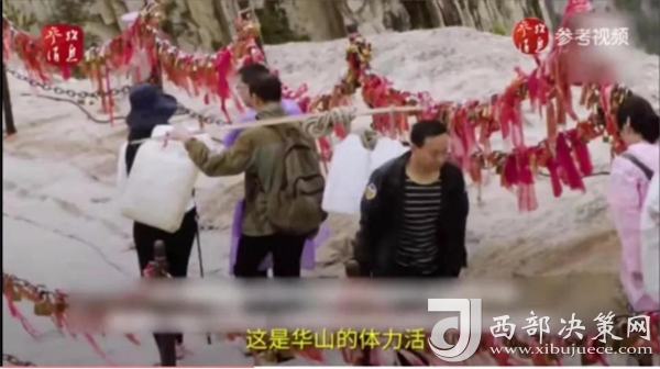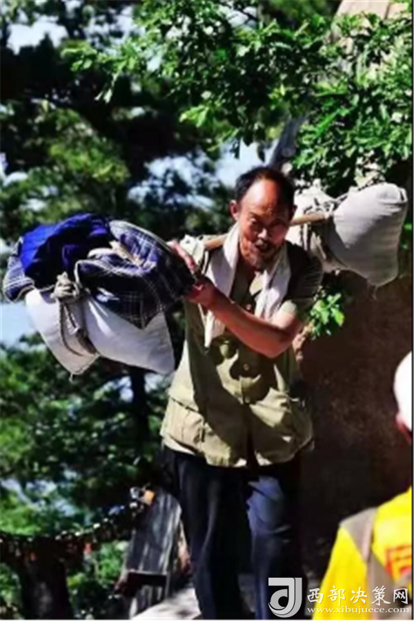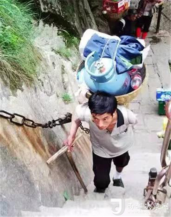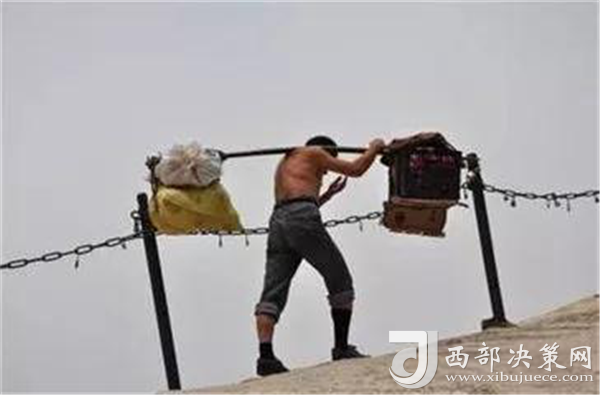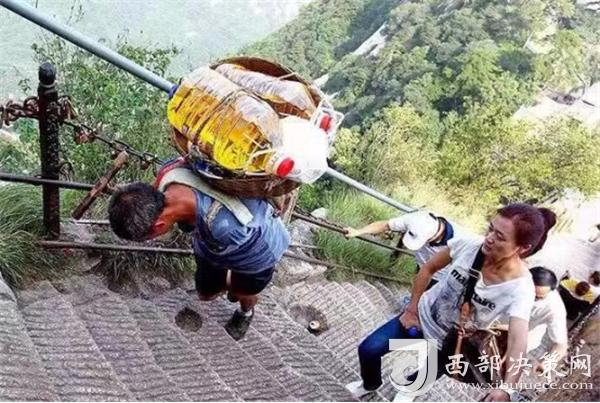 一位挑山工說:挑夫這個苦力活,已經(jīng)沒有年輕人來做。如今35歲以下的年輕人,對這個活瞧不上眼,寧可閑著,也不做挑夫。但是,華山景區(qū)的正常運營及后期建設,必須依賴于挑夫。這活兒,總得有人做。