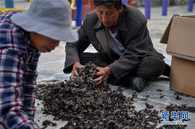 8月10日,四川壤塘縣下大石溝村村民收集晾干的青杠木耳。新華社記者 張超群 攝