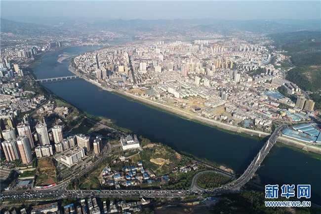清澈的漢江從安康市穿城而過(4月7日無人機拍攝)。新華社記者 邵瑞 攝