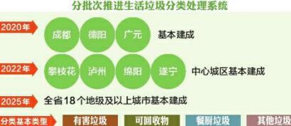 征求意見稿提出將加快建立分類投放、分類收集、分類運(yùn)輸、分類處置的生活垃圾處理系統(tǒng),促進(jìn)城鄉(xiāng)生活垃圾減量化、資源化、無害化,統(tǒng)籌推進(jìn)其他固體廢物處理處置,努力改善城鄉(xiāng)人居環(huán)境。到2020年,成都、德陽、廣元3個(gè)國家重點(diǎn)城市基本建成生活垃圾分類處理系統(tǒng),生活垃圾回收利用率達(dá)到35%以上;到2022年,攀枝花、瀘州、綿陽、遂寧4個(gè)省級(jí)示范城市的中心城區(qū)基本建成生活垃圾分類處理系統(tǒng);到2025年,全省18個(gè)地級(jí)及以上城市基本建成生活垃圾分類處理系統(tǒng)。