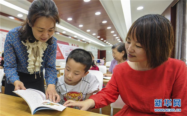 老師(前左)和家長(zhǎng)(前右)一起在永清縣城區(qū)街道公益書(shū)屋指導(dǎo)孩子誦讀(8月20日攝)。新華社記者 李曉果 攝