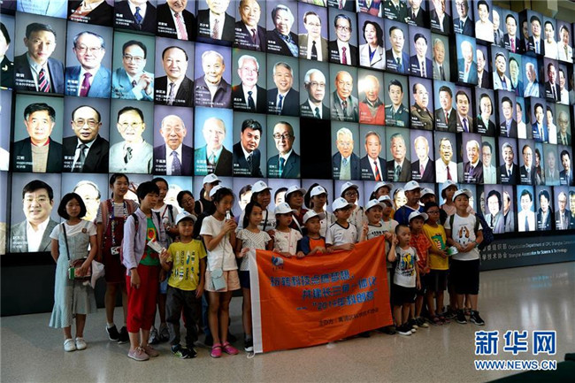 8月21日,觀眾在上??茖W(xué)會堂的院士墻前留影。