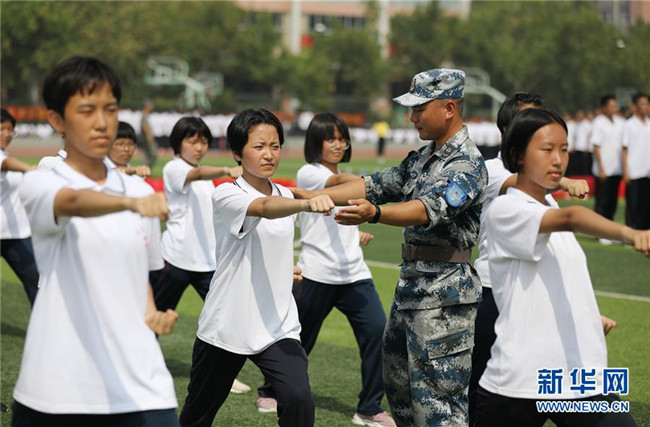 8月27日,河北省衡水市第二中學(xué)高一新生在教官指導(dǎo)下進(jìn)行軍訓(xùn)。