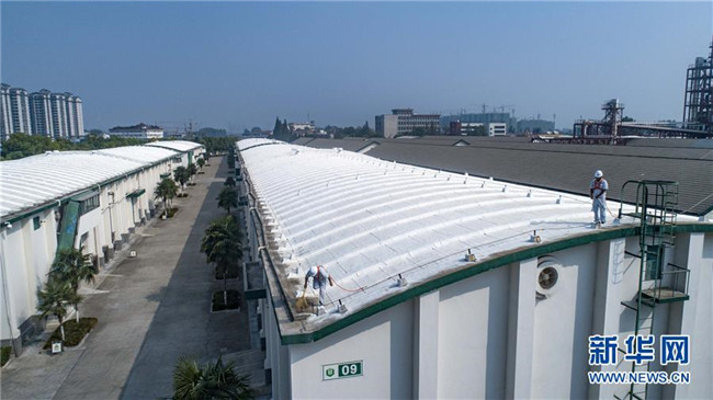 8月26日,中儲糧襄陽直屬庫兩名職工在檢查倉房屋面情況(無人機拍攝)。