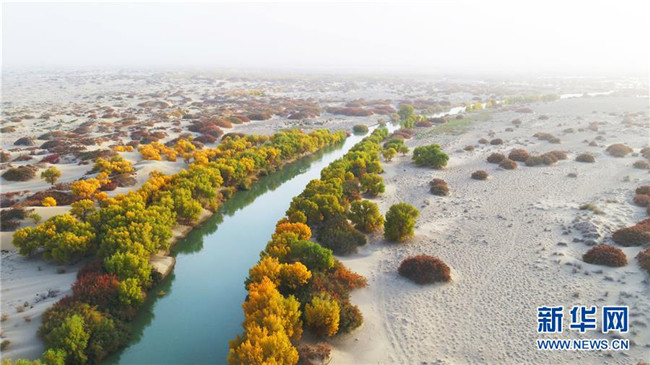 生態(tài)水滋養(yǎng)著塔里木河下游河道兩岸的胡楊,阻止了塔克拉瑪干與庫姆塔格兩大沙漠合攏(2017年10月15日無人機(jī)拍攝)。 新華社發(fā)(肖玉磊 攝)