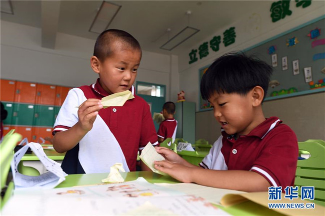 8月29日,一年級新生許加甄(左)和王淇在課間疊紙飛機(jī)。新華社記者 林宏 攝