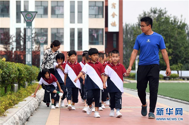 8月29日,體育老師宋陽(右)帶領(lǐng)一年級新生班同學(xué)前往體育館。 新華社記者 林宏 攝