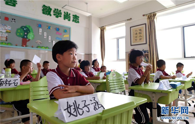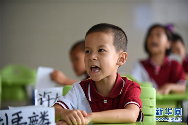8月29日,一年級新生劉禹麟在課堂上大聲朗讀。 新華社記者 林宏 攝