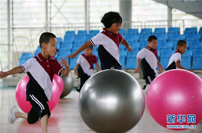 8月29日,一年級新生班的同學(xué)在體育課上玩瑜伽球。 新華社記者 林宏 攝