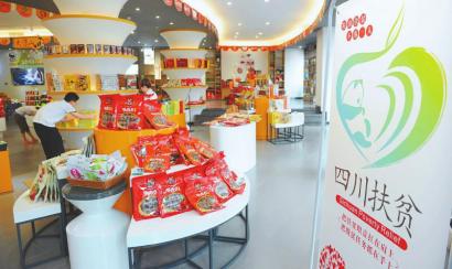在四川特產(chǎn)購物中心內(nèi)售賣的貼有“四川扶貧”公益性集體商標(biāo)的產(chǎn)品。四川日報(bào)記者何海洋攝