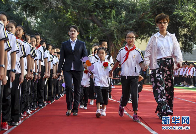 新學(xué)年伊始,新疆教育學(xué)院實(shí)驗(yàn)小學(xué)舉辦主題為“夢(mèng)想從這里啟航”的開(kāi)學(xué)典禮,一年級(jí)新生在六年級(jí)學(xué)生的引領(lǐng)下培養(yǎng)愛(ài)學(xué)校、愛(ài)師長(zhǎng)、愛(ài)學(xué)習(xí)的品德,走進(jìn)校園開(kāi)啟新生活。 新華社記者 王菲 攝