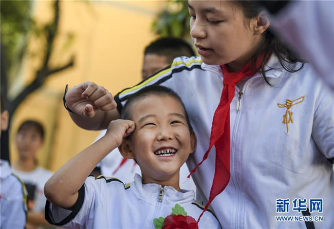 9月4日,新疆教育學(xué)院實(shí)驗(yàn)小學(xué)校園內(nèi),一年級(jí)新生在六年級(jí)學(xué)生的指導(dǎo)下學(xué)習(xí)握拳宣讀誓言。