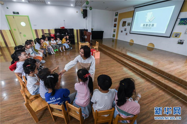 當(dāng)日,浙江省湖州市織里鎮(zhèn)晟舍幼兒園的小朋友們迎來(lái)了開(kāi)學(xué)第一課——垃圾分類課。幼兒園通過(guò)請(qǐng)小朋友觀看幻燈片、動(dòng)畫(huà)短片以及進(jìn)行趣味游戲等方式,讓孩子們?cè)陂_(kāi)學(xué)之初了解垃圾分類知識(shí)和垃圾分類的重要性。據(jù)了解,織里鎮(zhèn)所有幼兒園和中小學(xué)目前都已經(jīng)將垃圾分類常識(shí)課放入到學(xué)校日常課程中。 新華社記者 徐昱 攝